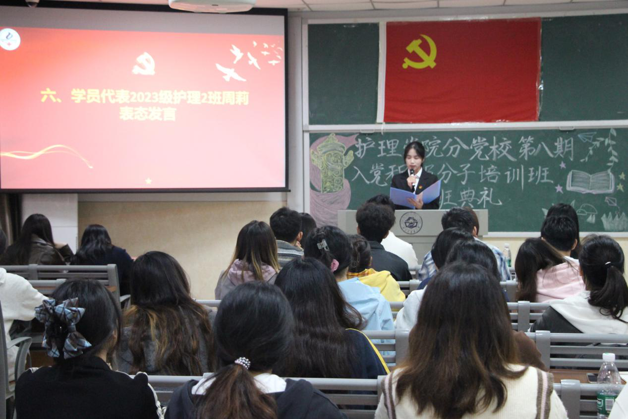 最后,学员代表2023级护理2班周莉同学表态发言,号召全体同学珍惜学习机会,并从端正态度、坚定信念、担当作为及严于律己四个方面作出了庄严承诺。