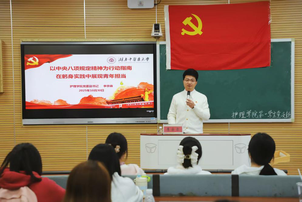为深入贯彻落实中央八项规定精神,强化青年群体尤其是学生党支部的发展对象和预备党员的纪律意识与责任担当,2025年10月30日16时,雷火电竞亚洲官网党委副书记李宗霖在济世楼400教室开展“以中央八项规定精神为行动指南,在躬身实践中展现青年担当”主题党课,第一学生党支部全体党员参加本次学习。