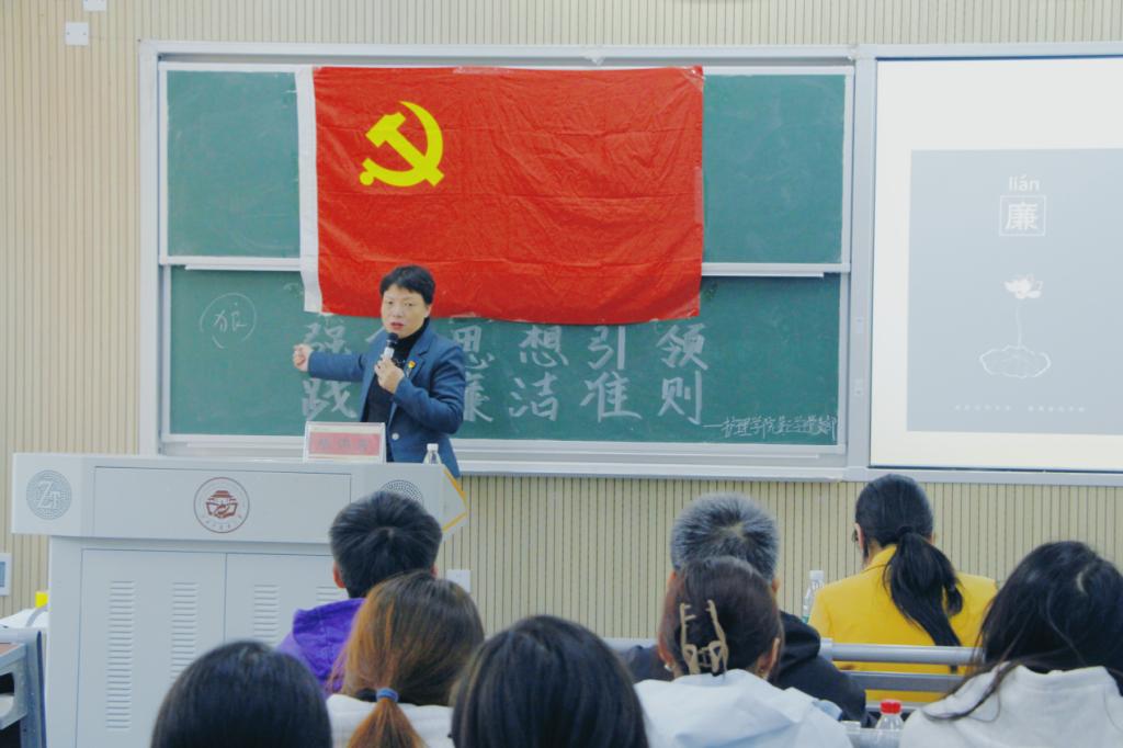 授课过程中,陈偶英院长从多个维度分析了廉洁建设的紧迫性,指出并强调廉洁是成长路上的保护伞,是确保事业行稳致远的“压舱石”。而后,陈偶英院长精选近几年来违反廉洁纪律的典型案例,通过剖析案例中以权谋利的腐败现象,警示全体学生党员需以案为镜,系好生涯“第一粒扣子”,在未来岗位中严守党纪国法红线。